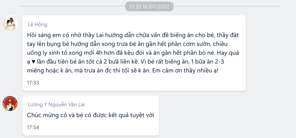 Hồi sáng em có nhờ thầy Lai hướng dẫn chữa vấn đề biếng ăn cho bé, thầy đặt tay lên bụng bé hướng dẫn xong trưa bé ăn gần hết phần cơm sườn, chiều uống ly sinh tố xong mới 4h hơn đã kêu đói và ăn gần hết phần bò né. Hay quá ạ ♥️ lần đầu tiên bé ăn tốt cả 2 bữa liền kề. Vì bé rất biếng ăn, 1 bữa ăn 2-3 miếng hoặc k ăn, mà trưa ăn đc thì tối sẽ k ăn. Em cảm ơn thầy nhiều ạ!